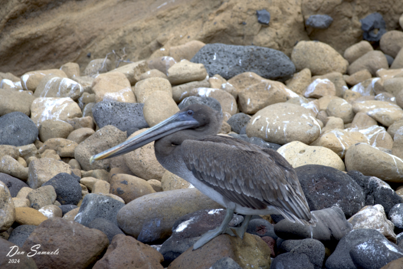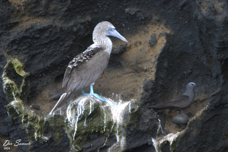 We also saw Galapagos penguins. Swimming penguins proved hard to photograph, and those out of the water seemed to want to stare at the rocks. And they mingle with iguanas. That is not a long-tailed penguin.
